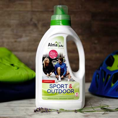 Dabei hilft AlmaWin Sport&Outdoor. Es ist ebenfalls völlig seifenfrei, so dass die Membran nicht zerstört und die feuchtigkeitstransportierenden Eigenschaften nicht eingeschränkt werden. Obendrein entfernt AlmaWin Sport & Outdoor auch noch den Schweißgeruch auf besondere Weise: Die üblen Geruchsstoffe, die bei der Zersetzung des Schweißes entstehen, werden einfach eingekapselt und gebunden. Da braucht es keinen aufdringlichen Duft, um den Geruch zu übertünchen. Sport&Outdoor punktet mit dezentem natürlichen Lavendelduft.