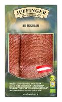 Zutaten: In 100 g BIO-Bergsalami sind 127 g Schweine-* und Rindfleisch* enthalten, Speck*, Speisesalz, Dextrose*, Gewürze*, Maltodextrin*, Konservierungsstoff: Natriumnitrit, Buchenrauch.| Energie | Fett | gesättigte Fettsäuren | Kohlenhydrate | Zucker | Eiweiss | Salz |