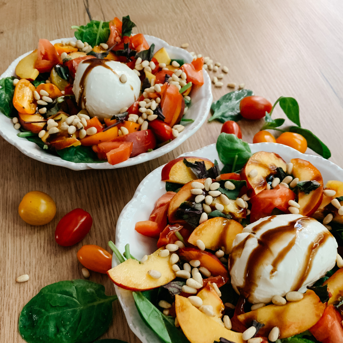 Den Babyspinat waschen und auf zwei Teller verteilen. Tomaten und Pfirsich waschen und in Scheiben schneiden. Anschließend werden die Tomaten- und Pfirsich-Scheiben auf dem Spinat verteilt. Wer mag kann die Pfirsich-Scheiben auch vorher in der Pfanne etwas anbraten.