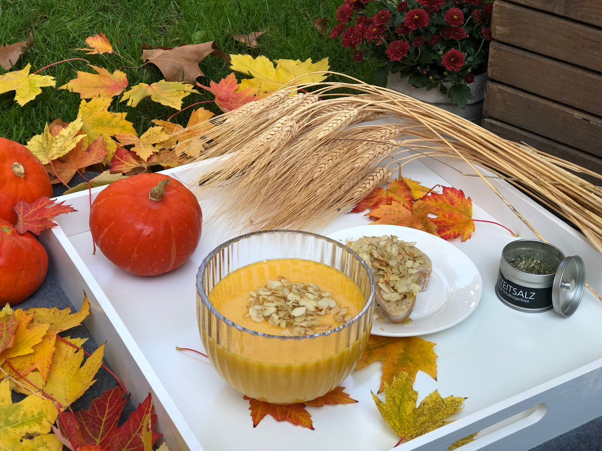 Den Kürbis waschen und aushöhlen. Die Kartoffeln schälen und zusammen mit dem Kürbis in kleine Stücke schneiden. Das Gemüse in einer Pfanne mit Öl anbraten. Mit der Gemüsebrühe ablöschen und 15 Minuten köcheln lassen.